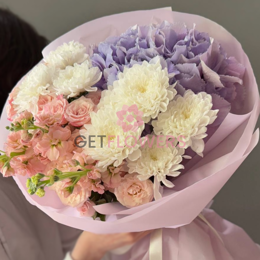 Гортензия, Роза кустовая, Хризантема, Эустома (лизиантус)