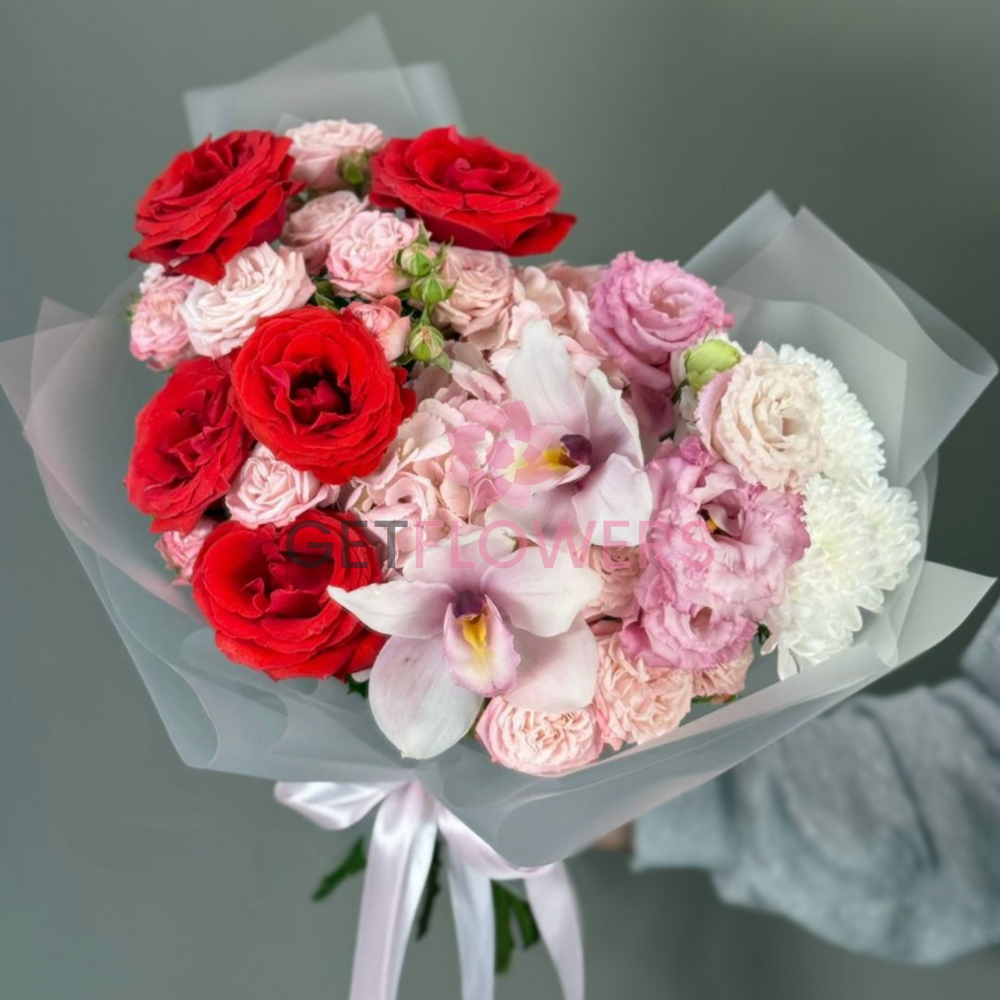 Букет из 13 белых, красных и розовых роз, эустом, орхидей