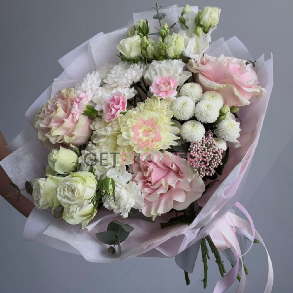 Букет из 13 белых и розовых хризантем, роз и эустом
