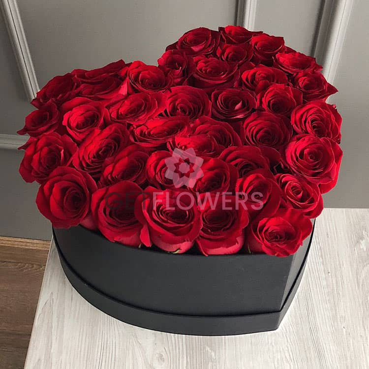 Букет из 37 красных роз в коробке в виде сердца