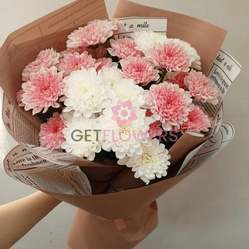Букет из белых или розовых кустовых хризантем, которые отличаются пышными, крупными бутонами, нежным ароматом и стойкостью. Очень нежный , ненавязчивый и в то же время привлекательный букет для милых дам.