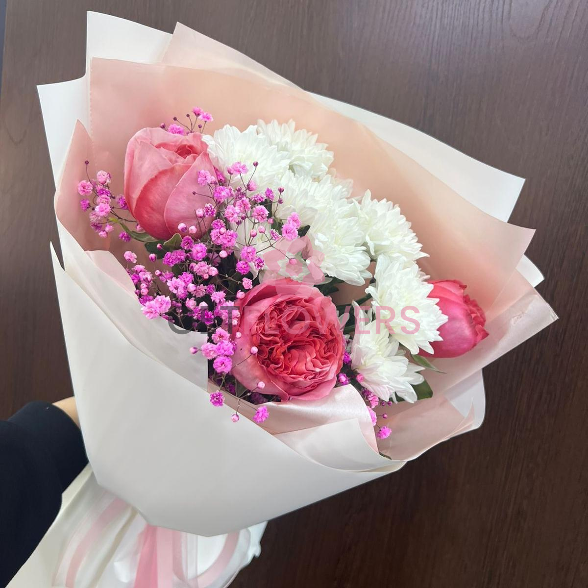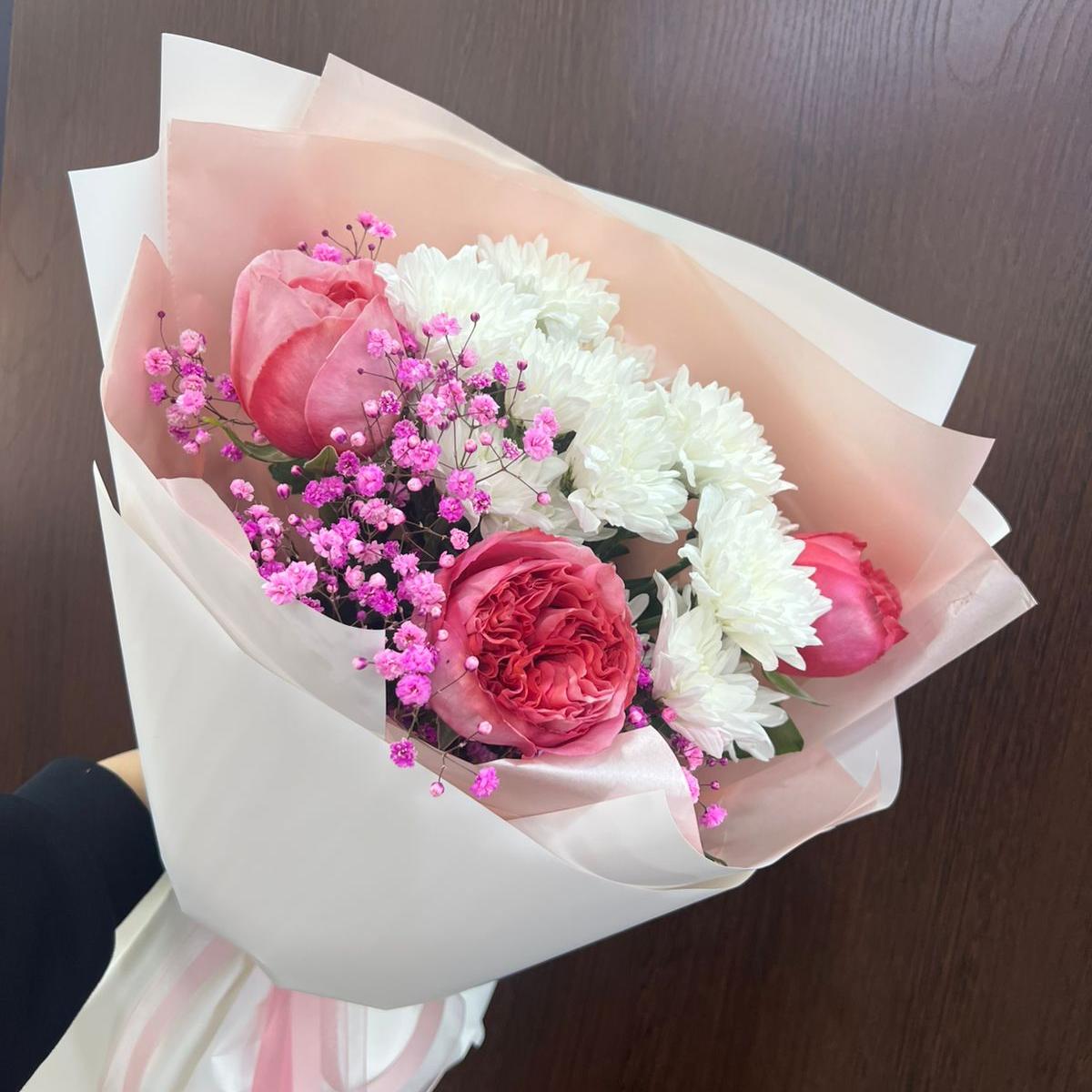 Букет из 5 белых и розовых роз, хризантем и гипсофила в упаковке