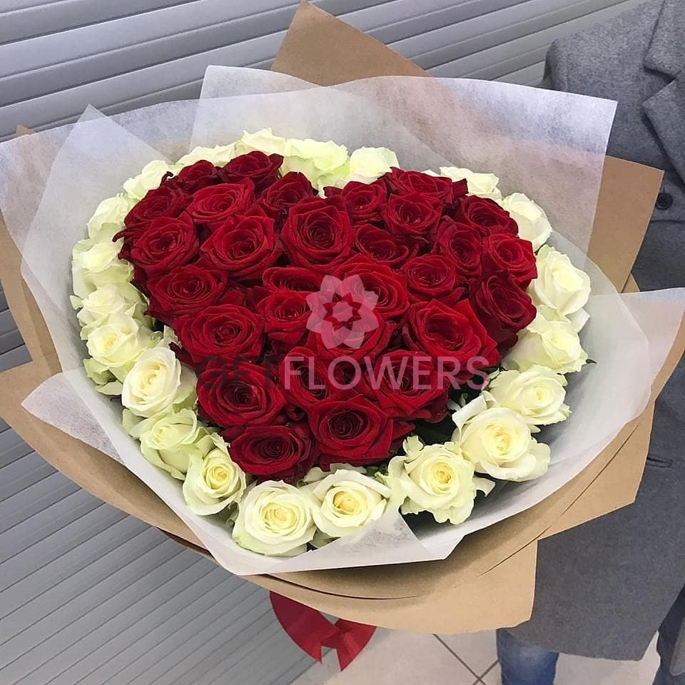 Букет из 51 красной и белых роз в виде сердца
