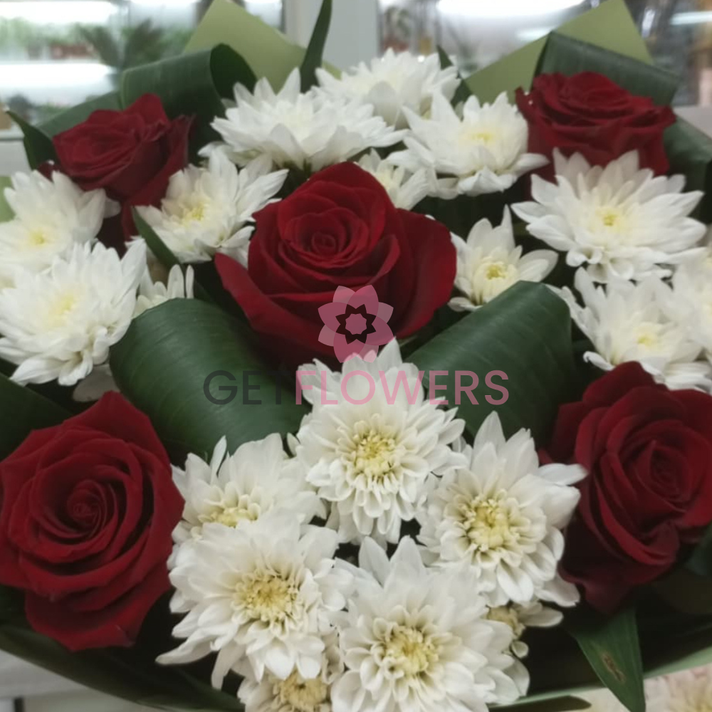 Букет из 9 роз и хризантем красного и белого цвета