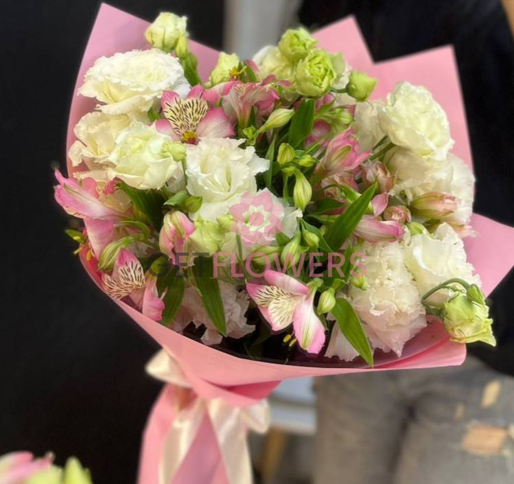 Букет из 9 белых и розовых эустом и альстромерий