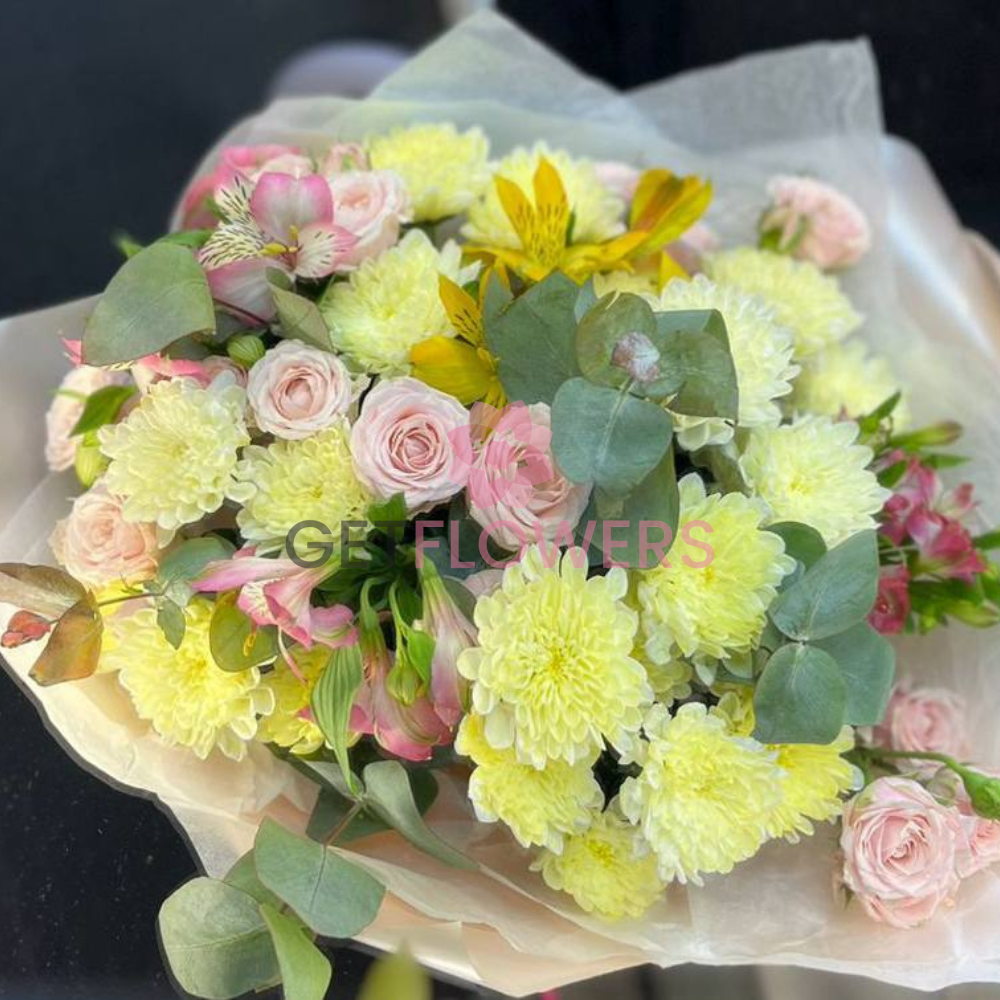 Букет из 11 желтых и розовых хризантем, роз, альстромерий