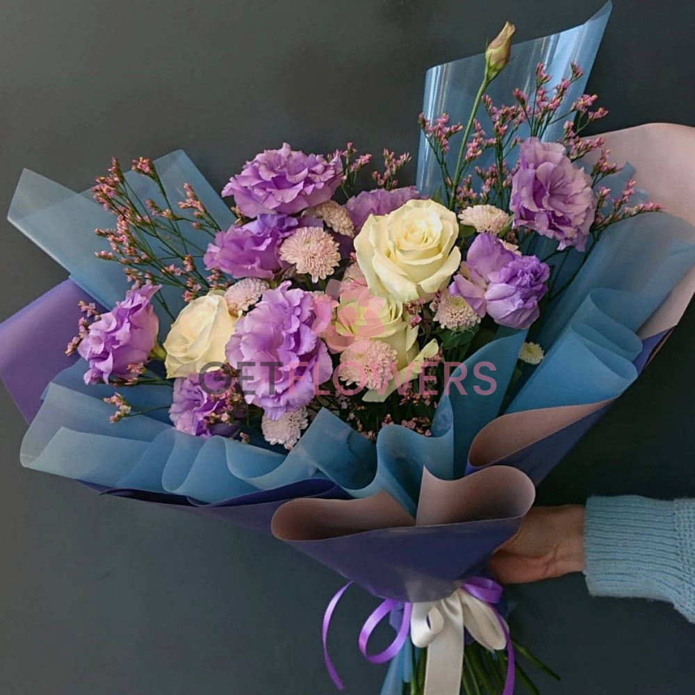 Букет из белых и сереневых кустовых хризантем, эустом и роз