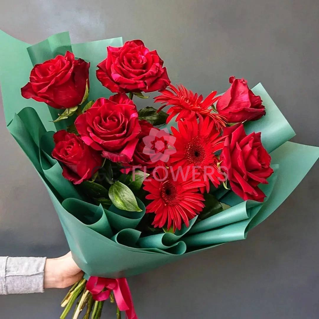 Букет из 11 красных гербер и роз