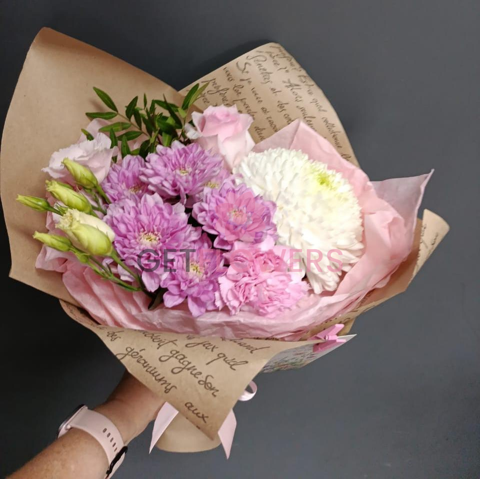 Букет из различного количества кустовых хризантем, гвоздик и роз разного цвета