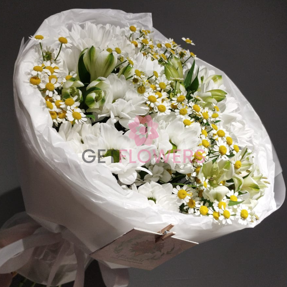 Букет из 11 кустовых хризантем, танацетум и альстромерий белого цвета