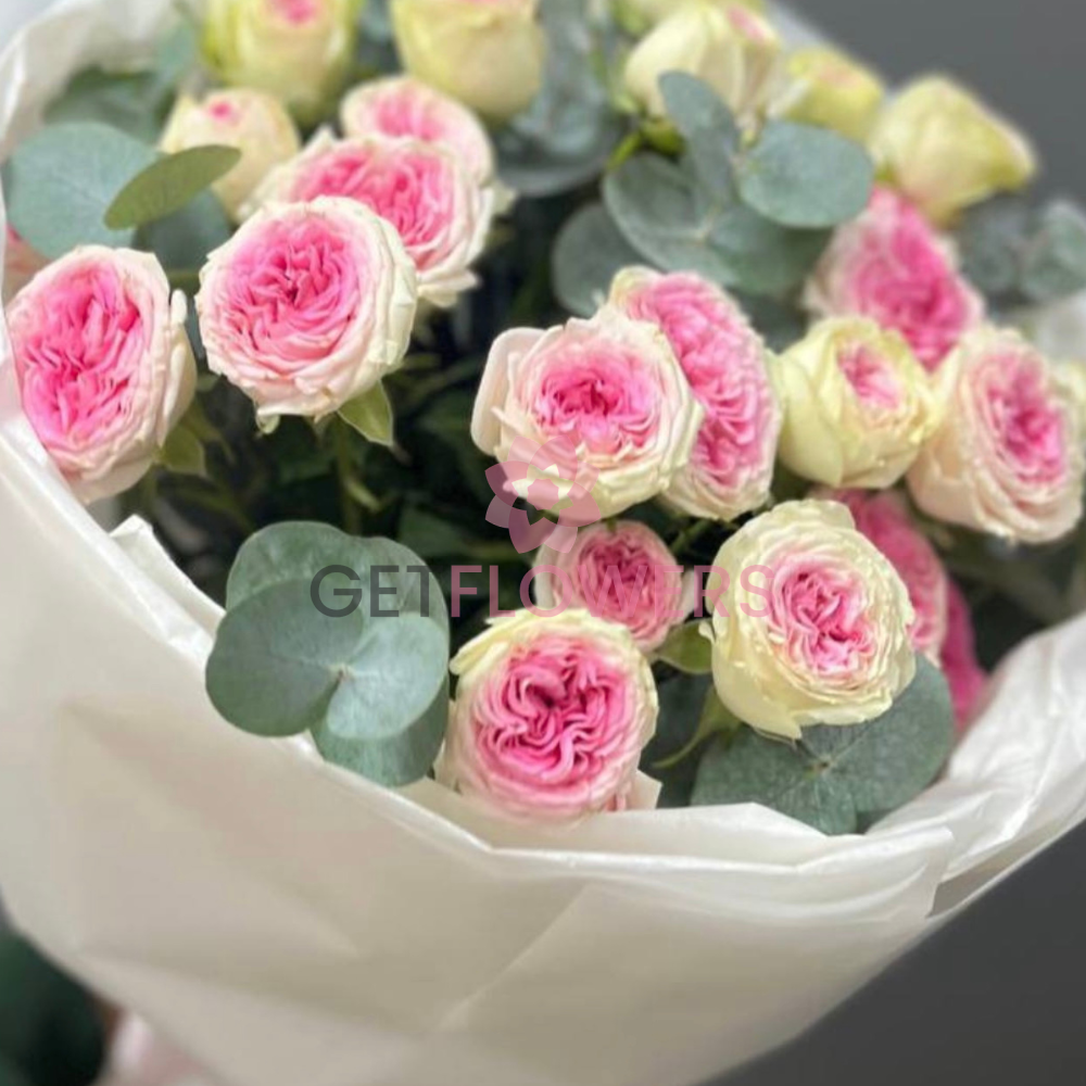Букет из 5 бело-розовых кустовых роз и эвкалипта