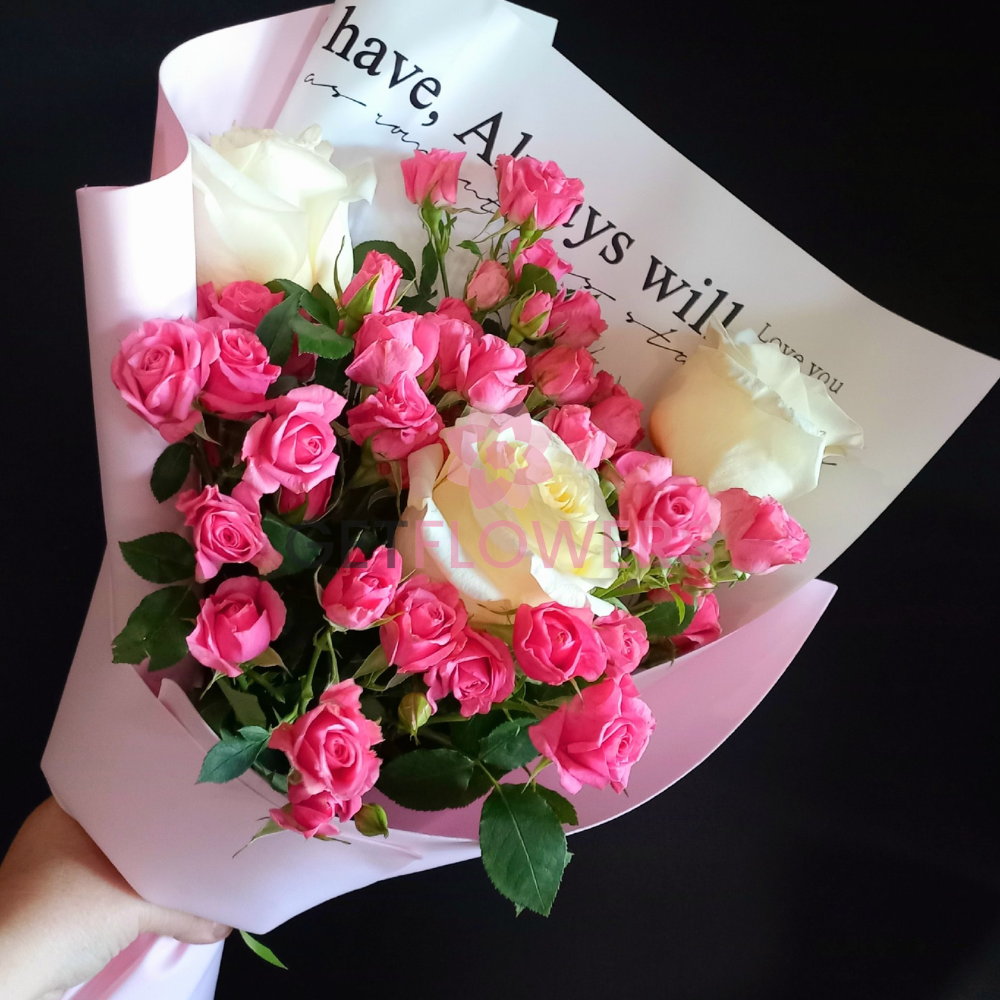 Букет из 7 белых и ярко-розовых роз