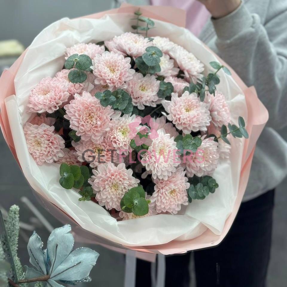 Букет из 5 розовых кустовых хризантем и эвкалипта