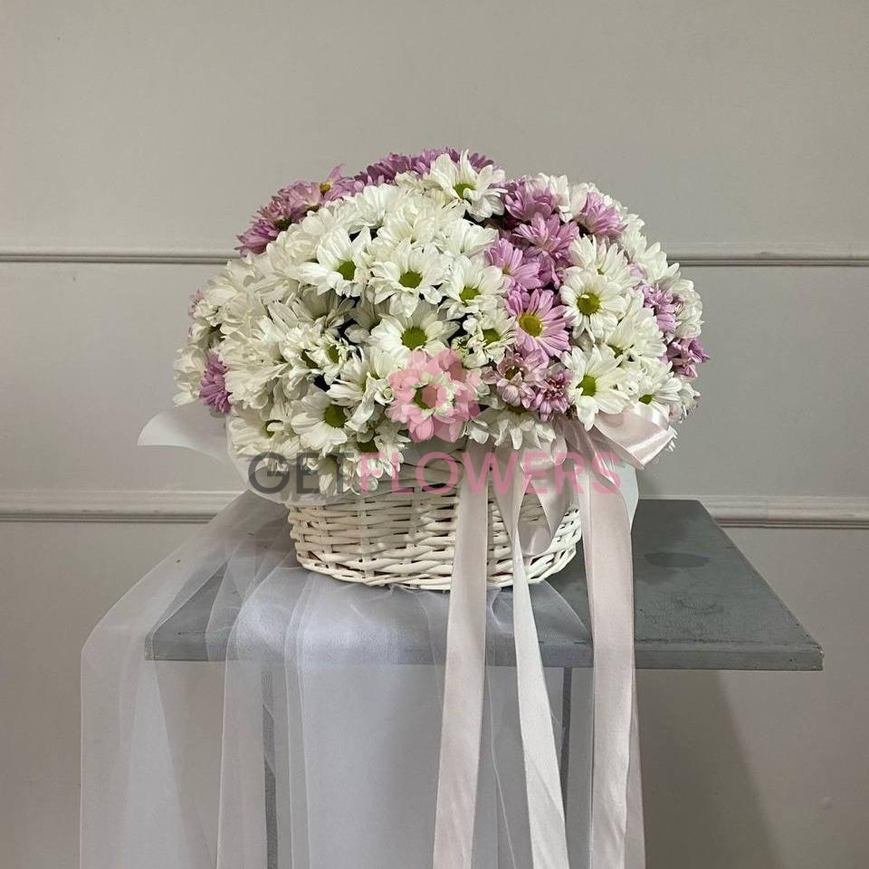 Букет из 9 белых и сиреневых кустовых хризантем в корзине