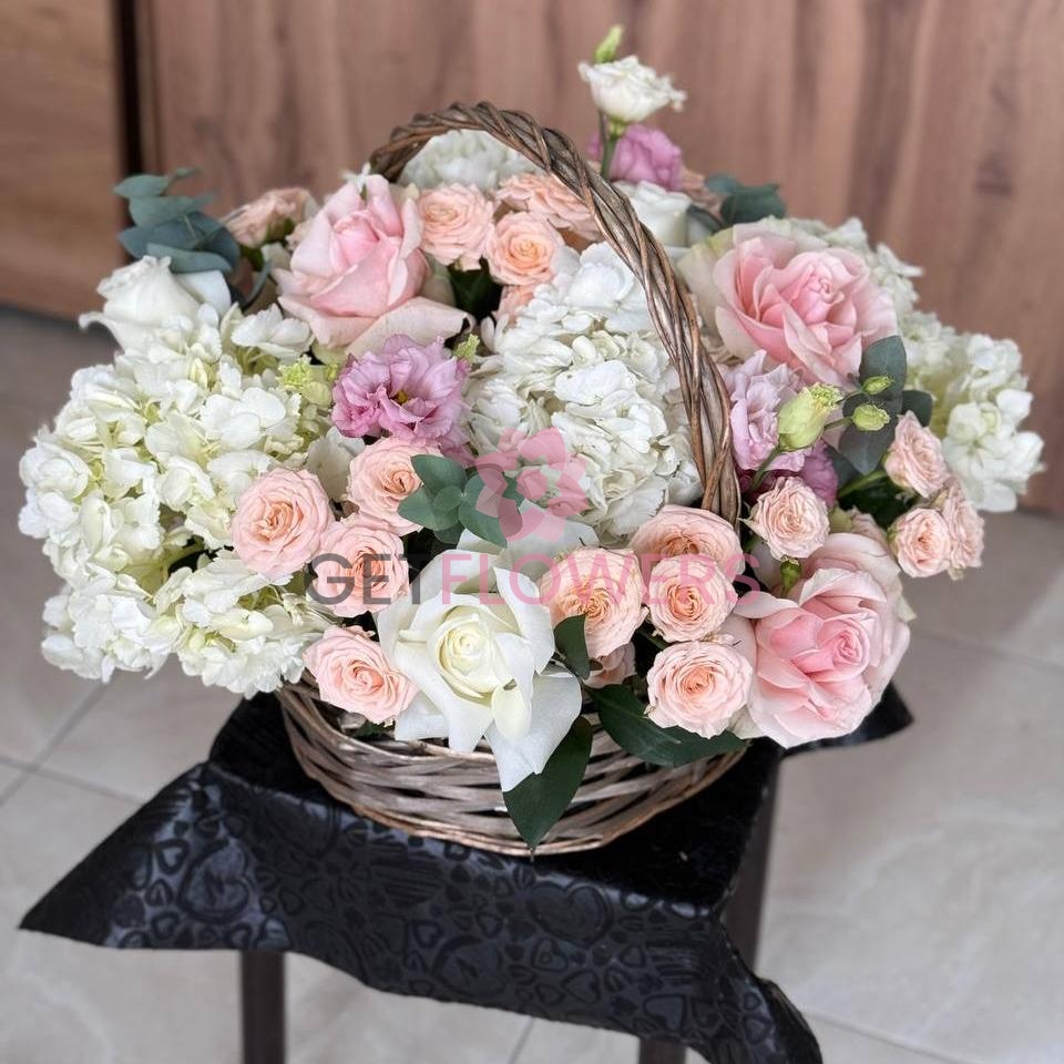 Букет сборный из разноцветных роз, гортензий, эустом и зелени в корзине