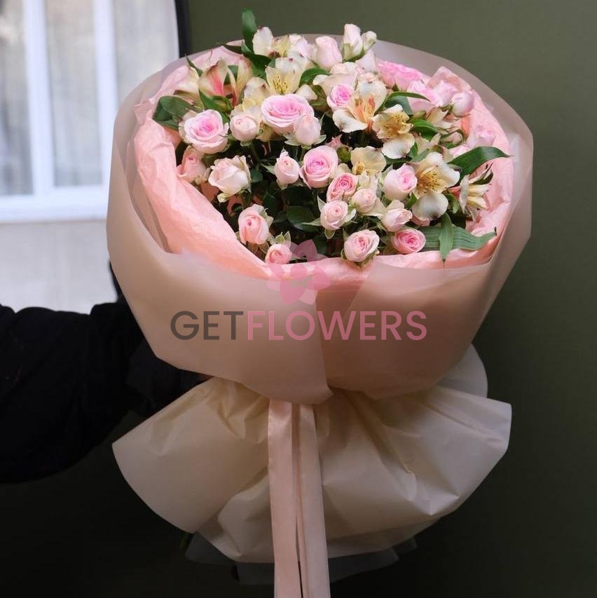 Букет из 9 белых и розовых роз и альстромерий