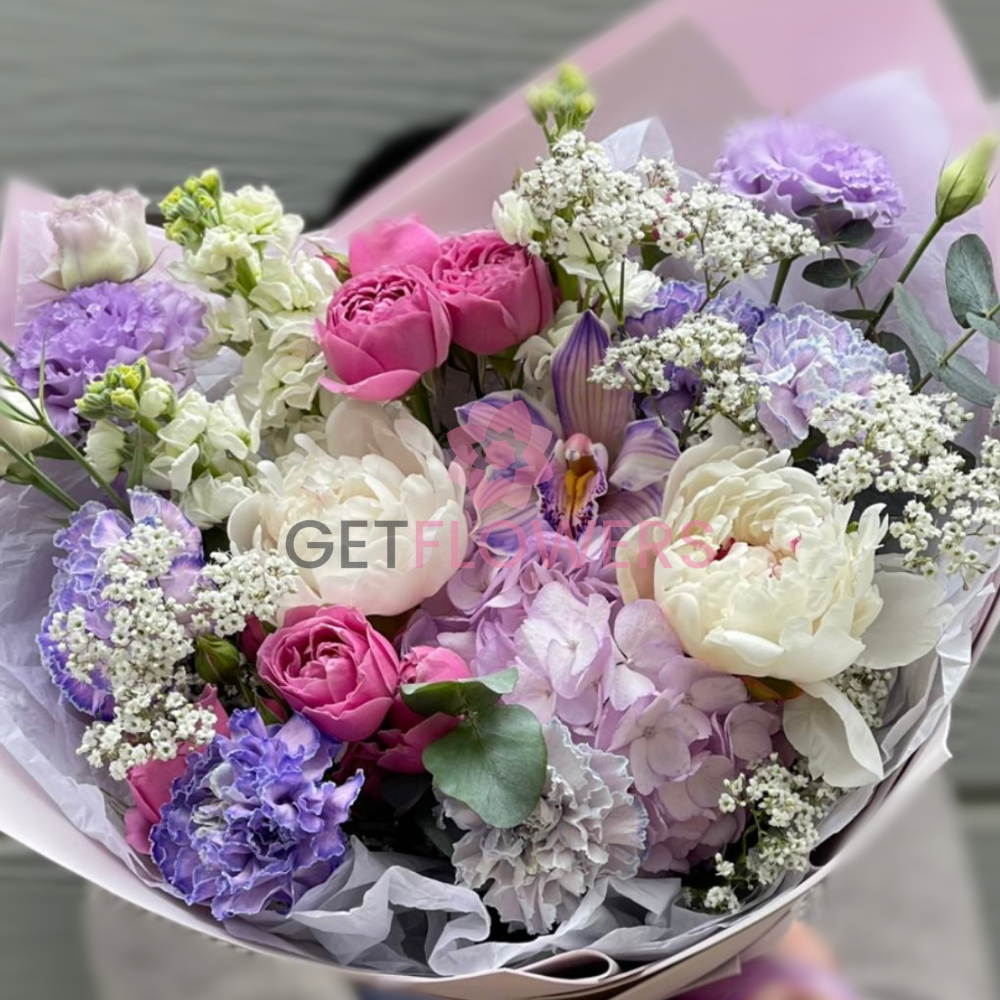 Гвоздика, Гипсофила, Гортензия, Орхидея, Пион, Роза кустовая, Эустома (лизиантус)
