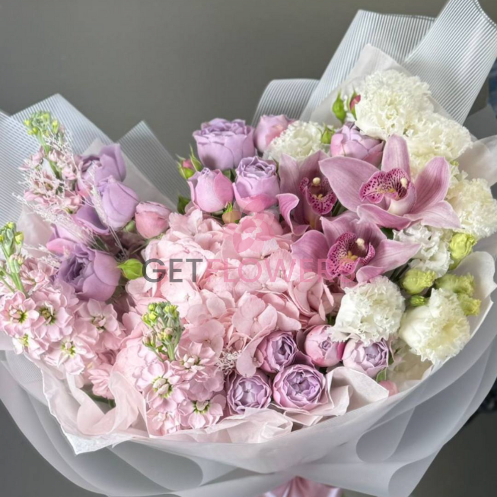Гвоздика, Гортензия, Орхидея, Роза кустовая, Эустома (лизиантус)