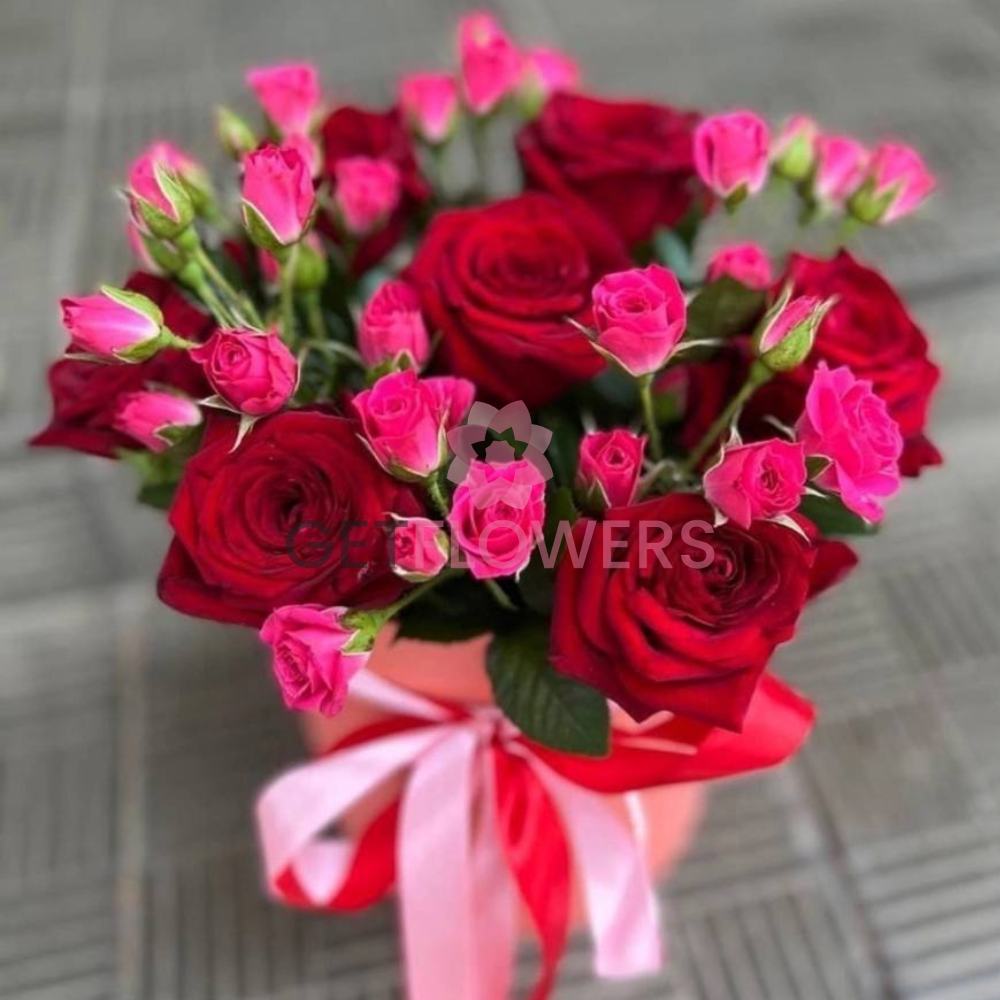 Букет из 11 розовых и красных роз в коробке