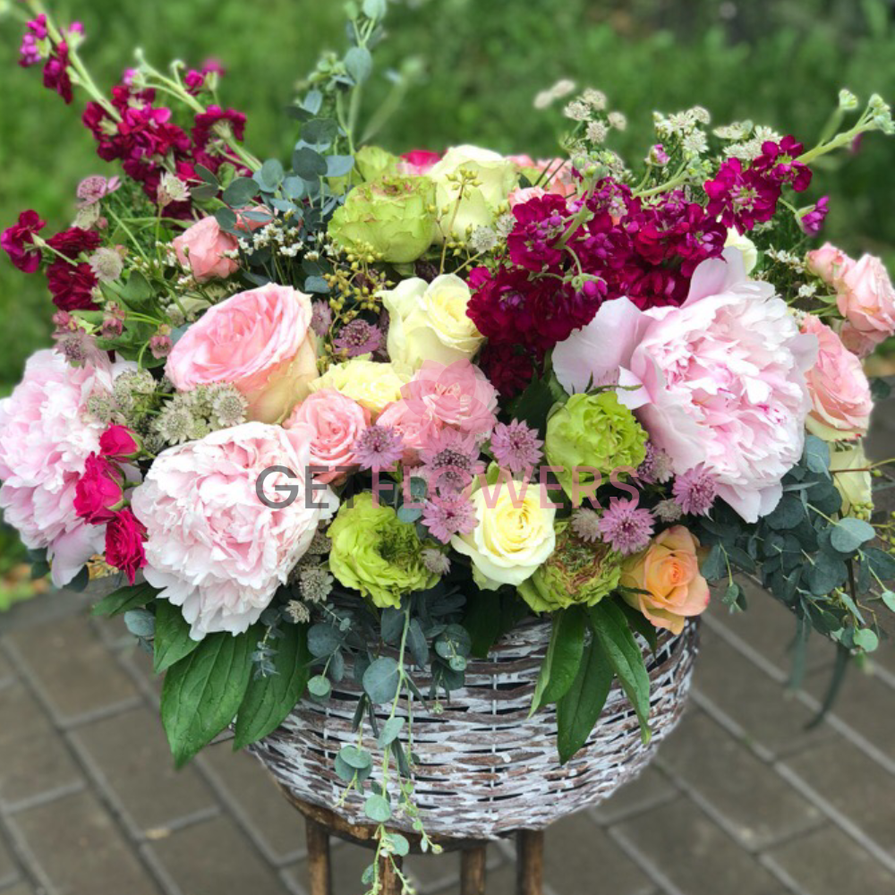 Букет из разноцветных розы, пионов, эустом, мелкоцветов и различной зелени в корзинке