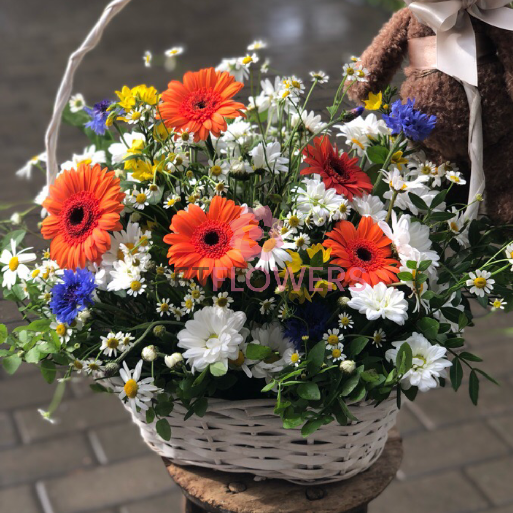 Букет из разноцветных гербер, полевой ромашки и зелени в корзинке