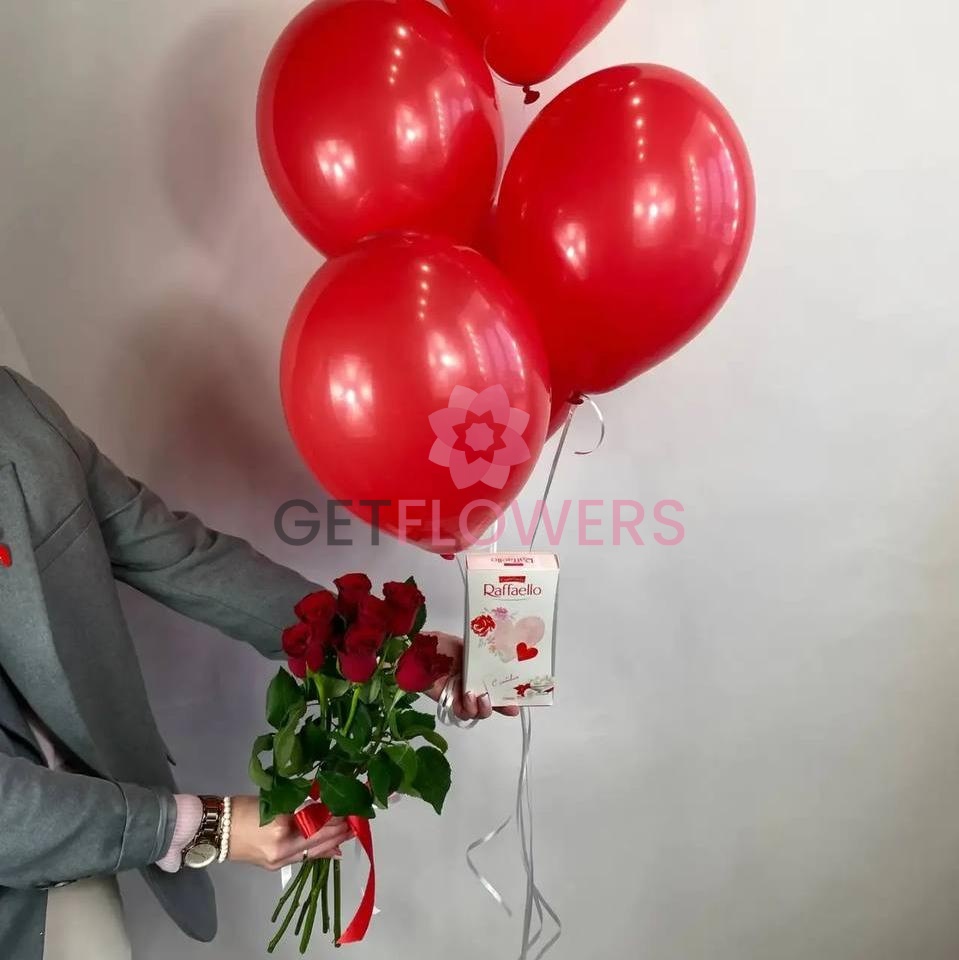 Комбо набор 2 из 7 красных роз, 3 шаров и рафаэлло